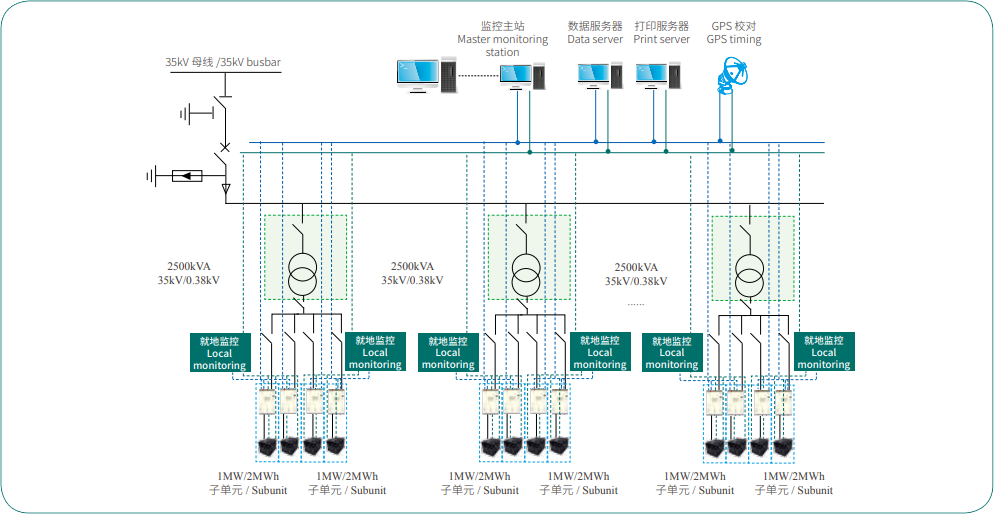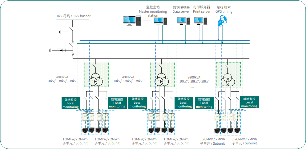 Grid side large-scale energy storage power station consists of monitoring system, energy storage system, and power supply and distribution system. The monitoring system communicates with the superior dispatching system, receives grid dispatching, and performs charging/discharging operation based on the instructed power depending on the system load, reduces the peak-to-valley difference and smooths the grid load fluctuation to achieve the purpose of peak load and frequency regulation. New energy wind and PV power station consists of energy storage local monitoring unit, energy storage unit and power distribution unit. It can be combined with the wind power generation unit and PV power generation unit to form a large-scale wind power, PV power and energy storage power station. The station level monitoring system monitors the output of each power generation unit in real time and by sending the charging/discharging power to the energy storage local monitoring unit, adjusts the output of the energy storage unit to realize effective energy management in the station, smooth the power output, reduce wind and PV power abandonment, improve power generation efficiency, and promote the application of renewable energy.
