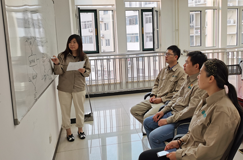 丁艳丽(左一)组织研讨分布式电源用户结算支付流程中出现的问题。