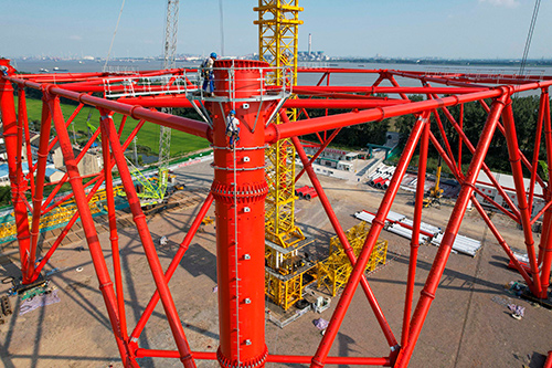 江苏泰州梅里长江大跨越工程建设者克服高温影响组塔作业。