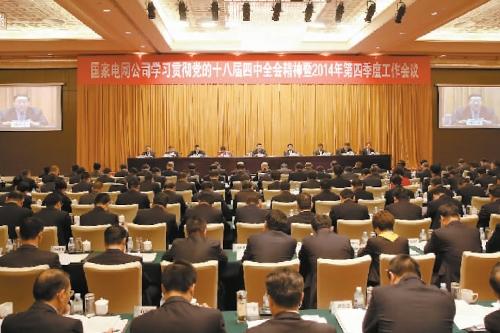 10月27日,国家电网公司在北京召开学习贯彻党的十八届四中全会精神暨2014年第四季度工作会议。会议的主要任务是,深入学习贯彻党的十八届四中全会精神,坚持依法治企、创新发展,总结前三季度工作,确保完成全年任务,科学谋划明年工作,全面推进“两个转变”,加快建设“一强三优”现代公司,更好地服务经济社会发展。