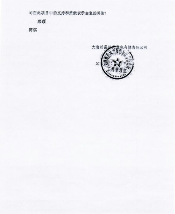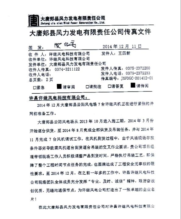 12月11日,大唐郏县风力发电有限责任公司向许继风电科技有限公司致函,大力赞扬许继工作人员在大唐郏县云阳风电场项目现场充分发挥“专业、及时、诚信”的工作精神,艰苦奋战创优质、无缝沟通保节点,保障了整个工程时间节点任务的完成,为许继打造出一张卓越的企业名片。