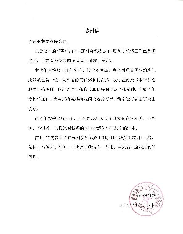 12月12日,国家电网公司运行分公司上海管理处向许继集团发来感谢信,高度认可并感谢柔性输电公司项目团队在锦屏-苏南±800千伏特高压直流输电工程苏州换流站检修过程中付出的艰辛努力。