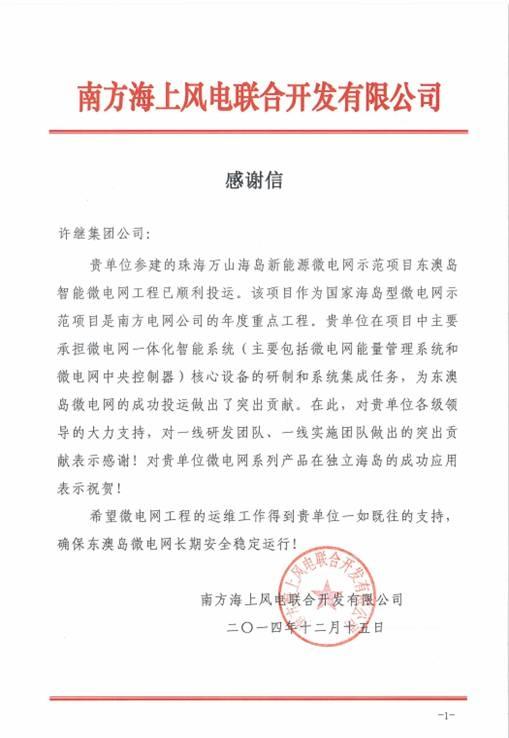 12月15日,南方海上风电联合开发有限公司向集团公司致函,信中说,珠海万山海岛新能源微电网示范项目东澳岛智能微电网工程前不久成功投运,对参与该项目建设的许继各级领导的大力支持,对公司一线研发团队、一线实施团队做出的突出贡献表示感谢!