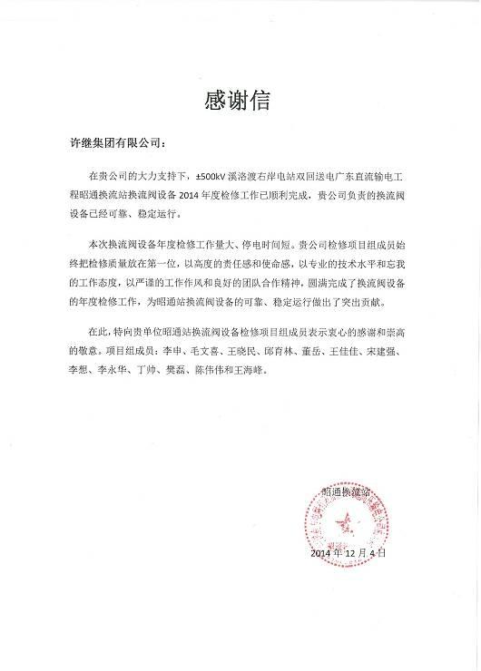 12月16日,中国南方电网有限责任公司超高压输电公司曲靖供电局昭通换流站向许继集团发来感谢信,赞扬许继设备检修项目组成员认真负责、克难奋进的工作态度,高度认可并感谢项目组成员在溪洛渡右岸电站送电广东±500千伏同塔双回直流输电工程(简称溪洛渡直流工程)昭通换流站换流阀设备检修过程中付出的艰辛努力。