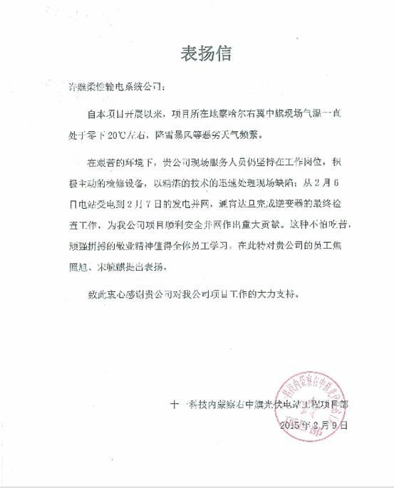 2月12日,十一科技内蒙古察右中旗光伏电站工程项目部向许继发来感谢信,高度认可并感谢现场工作人员在项目并网过程中付出的艰辛努力,对许继提供的优质光伏产品、精湛技术和完善服务表示衷心的感谢。