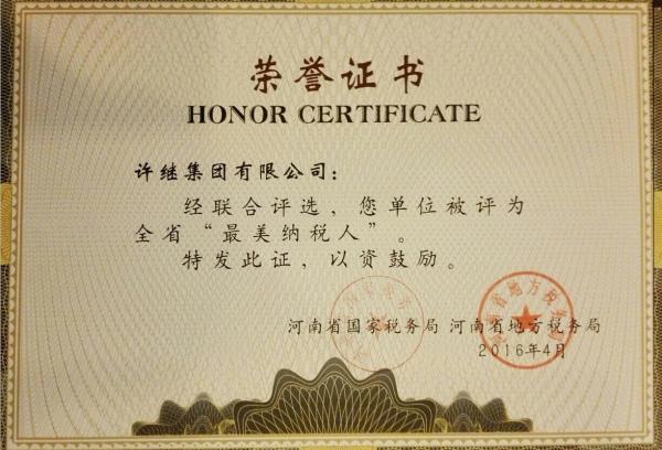 2015年,河南省国家税务局、河南省地方税务局联合开展“寻找最美纳税人”和“寻找最美税务人”活动,经过初选、审核、网络投票、专家评审等环节确定,最终确定包括许继集团在内的全省10名“最美纳税人”。