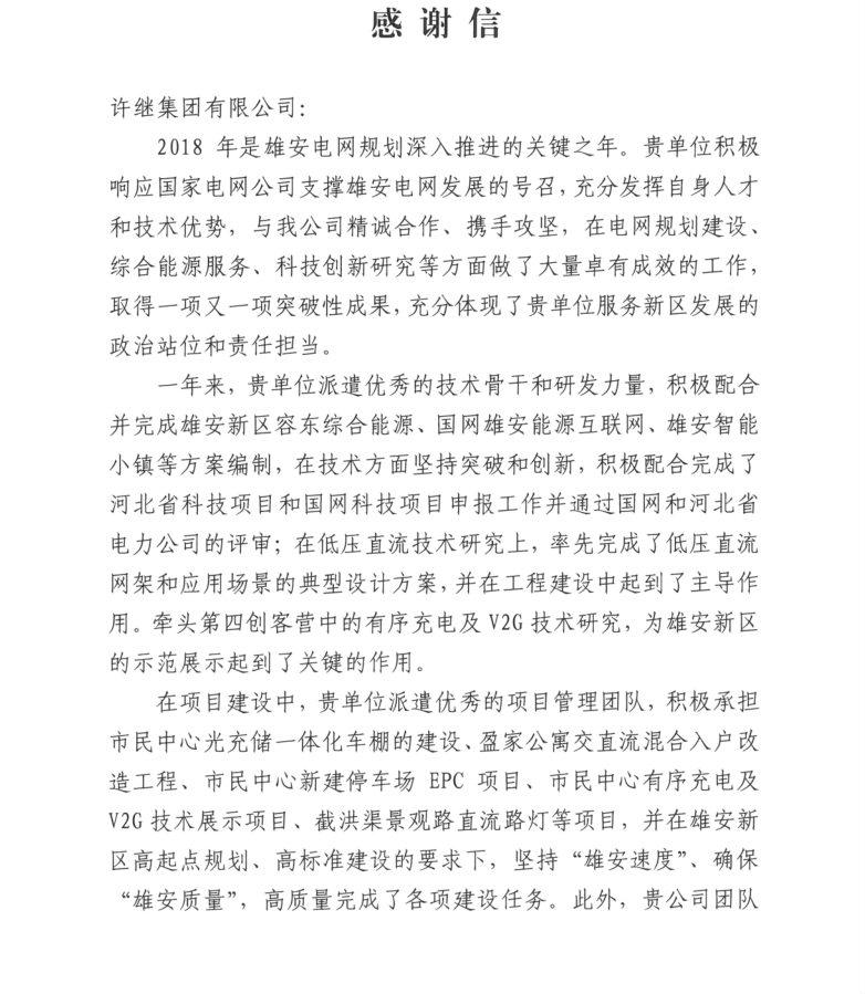 国网雄安新区供电公司来信,对许继集团一年以来的支持与帮助表示感谢。
