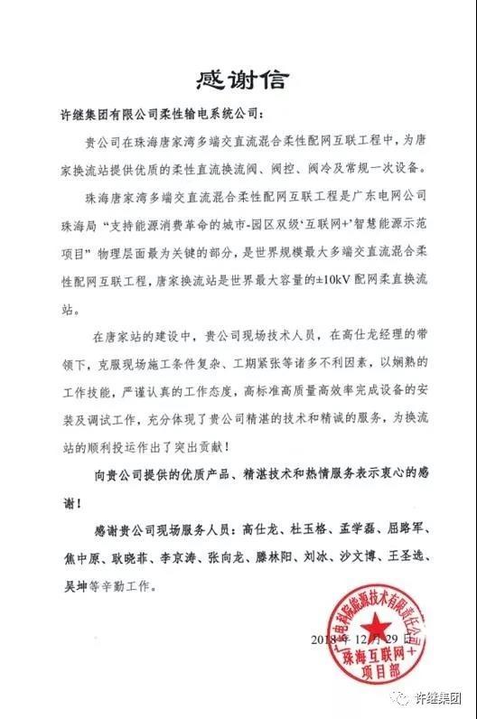 2018年6月,珠海“互联网+”智慧能源示范项目特种物资集成供货合同签订,许继集团整合在柔性直流技术领域的优势,创新思路,严格管控柔直阀的设计流程,制定完善的质量保障措施,确保项目按计划执行。2018年10月,完成柔直阀电磁兼容试验、例行试验、型式试验、全电压运行试验,完成换流站启动回路、阀冷却系统、桥臂电抗器等设备的研发、设计、生产及试验工作。
