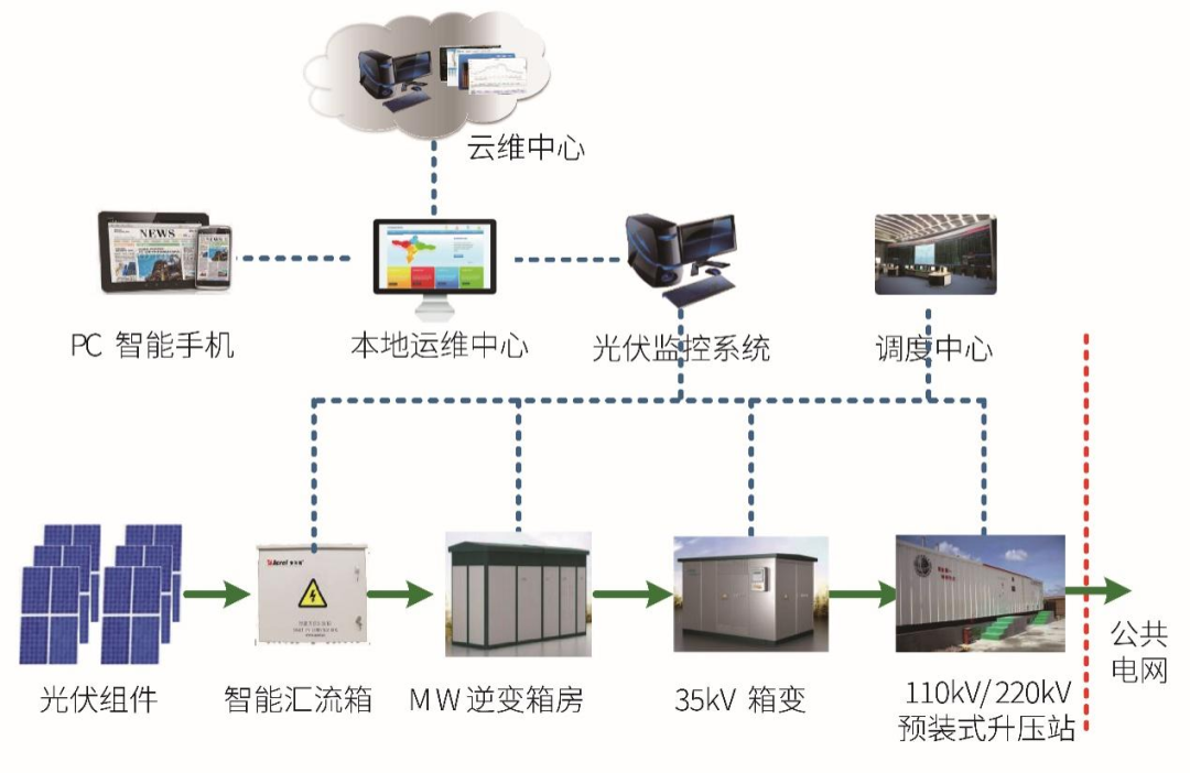 大型地面并网光伏电站是指与公共电网相联接且共同承担供电任务的太阳能光伏电站。它是太阳能光伏发电进入大规模商业化发电阶段、成为电力工业组成部分的重要发展方向,是当今世界太阳能光伏发电技术发展的主流趋势。许继预装式升压站、GIS开关、储能系统等产品可为该解决方案提供设备支撑。