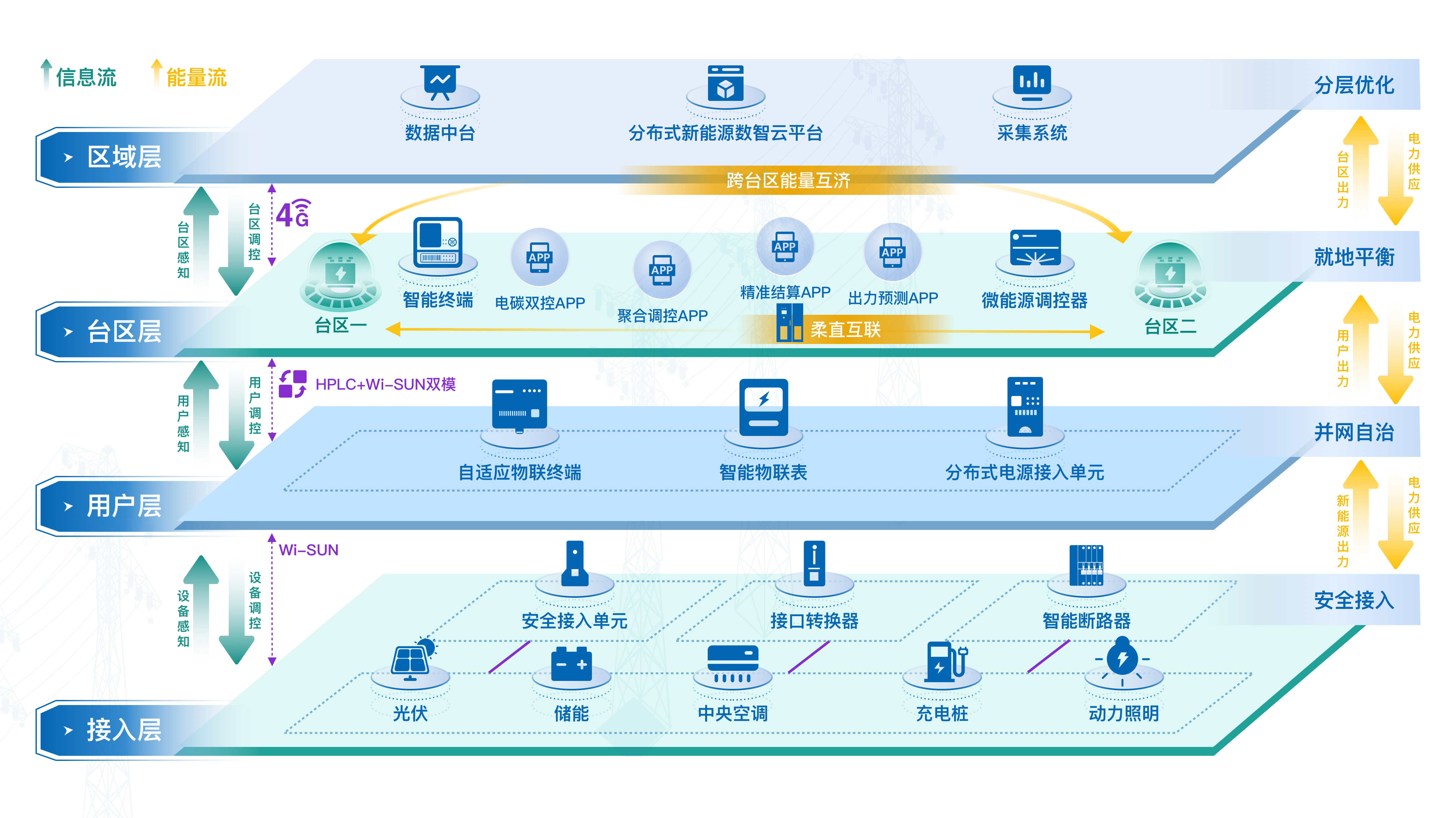 源荷平衡解决方案基于云管边端体系架构,全环节贯通信息流和能量流,实现光储充用协同管理。在云侧,建设分布式新能源数智管理平台,基于智能体及AI大模型技术实现光储充用异质资源融合接入及智能管理。在边侧,内嵌基于安全、经济、低碳运行的多模态就地化内外双循环调控与实时滚动优化策略,研发聚合调控、电碳双控等APP,支持多形态台区终端跨平台运行,提升多元负荷就地调控能力。在端侧,研发并应用多品类安全接入设备,支持差异化环境下的光储充用标准化接入,采用即插即用、快速组网的父子集群IP化的多跳网状网技术,实现数据安全高效传输。