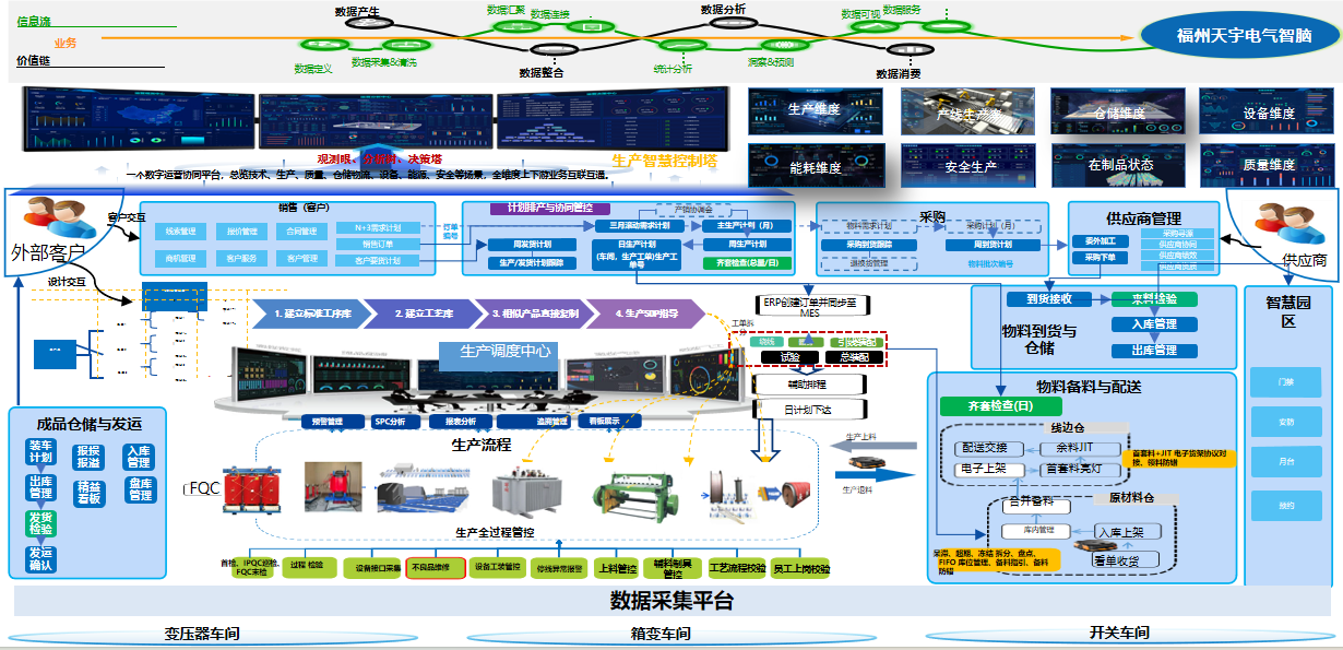 通过建设大型油浸式变压器2D/3D磁热仿真软件、CAD设计软件的定制开发,深度集成设计工具链与MOM,实现从概念设计到交付的全数字化价值链。以MOM系统作为核心,通过设备端的智能制造转型,打通了设计、生产、物流等环节的数据流,实现了"设计-仿真-生产"闭环管理。通过5S专网、MOM系统与AGV等智能设备的高效协同,海量设备数据可实时传输,延迟降低至毫秒级,实现生产的透明化管理,设备综合效率提升10%-30%,订单交付周期缩短30%以上,降低碳排放15%,构建了高效、智能、绿色的现代制造体系。