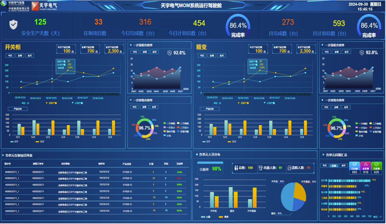 天宇电气对标行业优秀案例,梳理固化了36个生产业务流程,成功搭建生产运营管理(MOM)平台,MOM系统作为智能工厂的“中枢神经”,实现了真正的生产透明化管理,打造“一眼看全、一眼看穿、一眼看透、一竿子到底”的数字化管控平台,实现订单交付主线的全流程数字化管理。同时,引入AI质量检测系统,将缺陷漏检率控制在0.5%以下。5G网络的应用确保了设备数据的实时传输,为远程监控和智能决策提供有力支持。