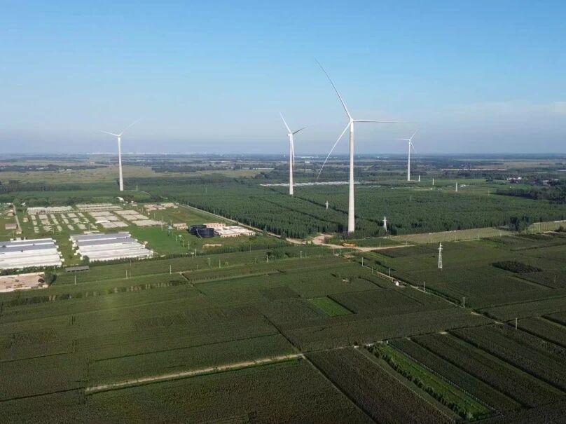 项目扎根河北省邢台市巨鹿县苏家营镇,16台6.25兆瓦的巨型风机擎天而立,宛如一群绿色能源卫士,时刻捕捉着风能转化为清洁电力的机遇。